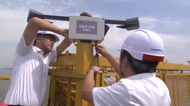 另一个智慧方面,是工人们桥上安装的能见度仪,它的功能是检测能见度。团雾是交通气象中对安全影响较大的因素之一,针对曹娥江江面团雾频发的问题,建设单位选择在大桥每隔800米设置一个能见度仪,打造雾区诱导警示系统,能够即时准确发现桥面任何区域出现的团雾并联动后方1~3公里范围内情报板、智能指示标以及导航运营商发出团雾距离预警信息,并在雾区内设置雾区诱导灯,通过标识道路轮廓以及可视距离,引导车辆顺利通过。