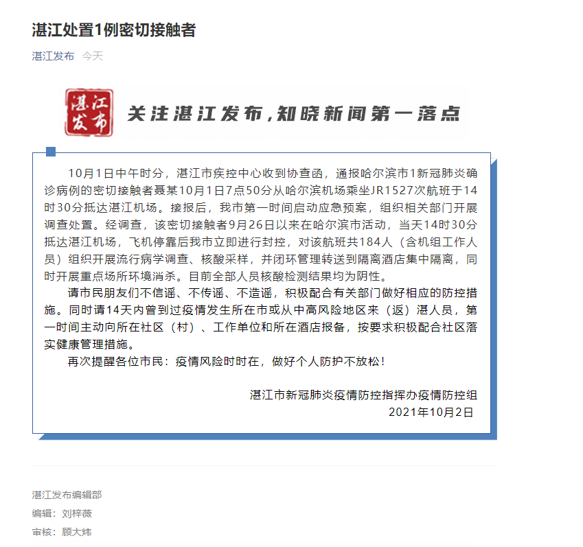 据“湛江发布”微信公众号消息,广东湛江通报一例新冠肺炎确诊病例的密切接触者,目前同一航班的184人已转移到隔离酒店集中隔离,全部人员核酸检测结果均为阴性。