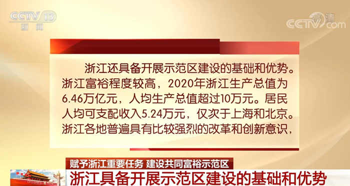 央视网消息:今年6月,中共中央、国务院《关于支持浙江高质量发展建设共同富裕示范区的意见》发布,赋予浙江重要示范改革任务,先行先试、作出示范,为全国推动共同富裕提供省域范例。