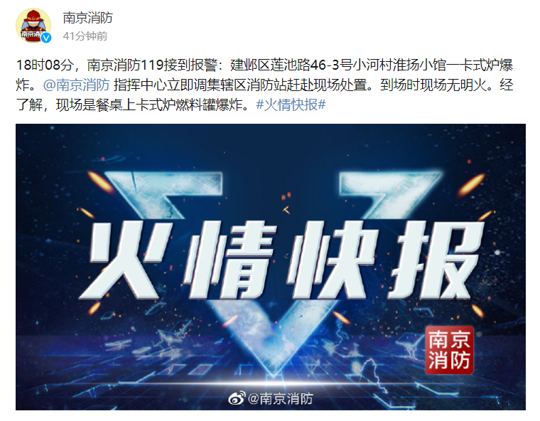 据南京消防消息,10月2日18时08分,南京消防119接到报警:江苏省南京市建邺区莲池路46-3号小河村淮扬小馆一卡式炉爆炸。南京消防指挥中心立即调集辖区消防站赶赴现场处置。到场时现场无明火。经了解,现场是餐桌上卡式炉燃料罐爆炸。