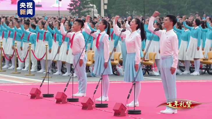 最终,来自中国传媒大学的大三学生冯琳、中央财经大学的大四学生赵建铭、北京市中关村第三小学的六年级学生彭友馨和北京市第一实验小学六年级学生姚牧晨站在团队最前面,带领千人献词团,更是代表全国亿万青少年,向党许下青春诺言。