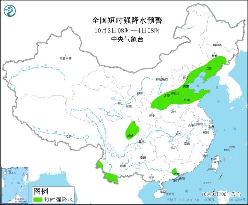 中央气象台10月3日6时继续发布强对流天气蓝色预警:预计10月3日8时至4日8时,吉林东南部、辽宁中东部和南部、河北南部和东北部、山东北部、河南北部以及四川盆地中西部等地的部分地区将有8~10级雷暴大风或冰雹天气;吉林东南部、辽宁大部、河北中南部和东北部、天津、山东大部、河南北部、陕西中北部、山西中南部以及四川盆地中西部、云南西南部、广东中部等地的部分地区将有短时强降水天气,小时雨量20~40毫米,局地可达50毫米以上。
