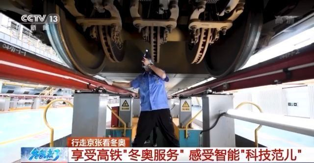 说完了京张线上的服务,再带大家去冬奥列车停留检修的4s店——北京北动车运用所看看。白天冬奥线上的动车组走在冬奥线上,晚上,高铁动车组就要回到这里检修维护了。结束运行任务后,动车组按计划检修。为了进一步确保冬奥动车组运行安全,这里引入了车底检修机器人,采用人检和机检混合检修模式。