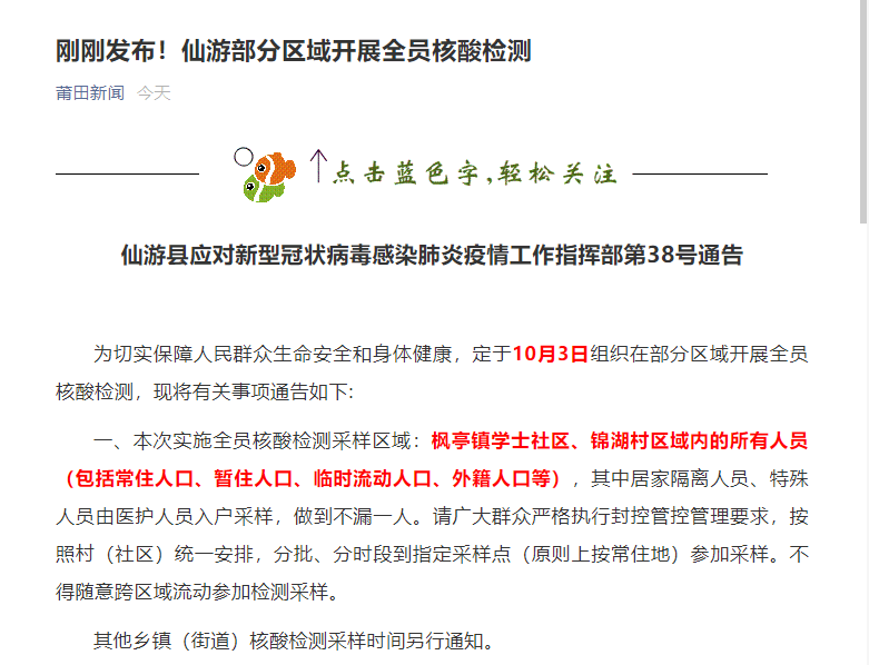 福建省莆田市仙游县应对新型冠状病毒感染肺炎疫情工作指挥部发布通告称,为切实保障人民群众生命安全和身体健康,定于10月3日组织在部分区域开展全员核酸检测,现将有关事项通告如下: