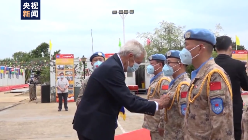 当地时间10月2日,中国第七批赴南苏丹(朱巴)维和步兵营授勋仪式在南首都朱巴联合国南苏丹特派团总部隆重举行。联合国秘书长特别代表兼联合国驻南苏丹特派团(联南苏团)团长海索姆、副特别代表丛光、联南苏团部队司令谢里什中将和中国驻南大使华宁等出席。