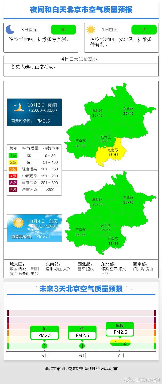 央视网消息:据北京市生态环境监测中心空气质量预报:3日夜间,冷空气影响,扩散条件有利,预计空气质量指数30-50,1级,优。