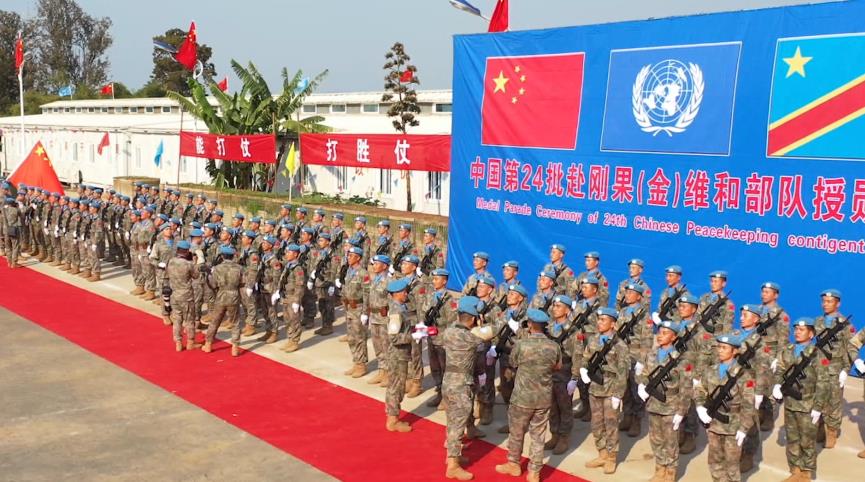 中国第24批赴刚果(金)维和部队由工兵、医疗两支分队组成,自去年9月轮换部署一年来,积极应对任务区政局动荡、暴恐频发、疫情肆虐、环境恶劣等多重考验,出色完成道路修复、桥梁抢修、直升机停机坪构筑和医疗救治、人道主义救助等任务,受到联刚稳定团及当地政府高度的评价,荣获联刚稳定团、南战区两级司令嘉奖以及南基伍省议会嘉奖,218名维和官兵全部被联合国授予“和平勋章”。