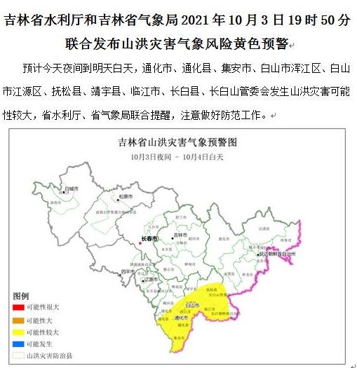吉林省水利厅和吉林省气象局2021年10月3日19时50分联合发布山洪灾害气象风险黄色预警: