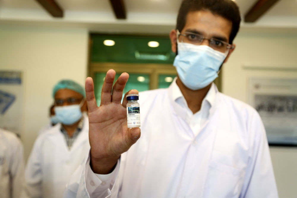 6月1日,在巴基斯坦伊斯兰堡,工作人员展示本地灌装生产的中国康希诺新冠疫苗。新华社发(艾哈迈德·卡迈勒摄)