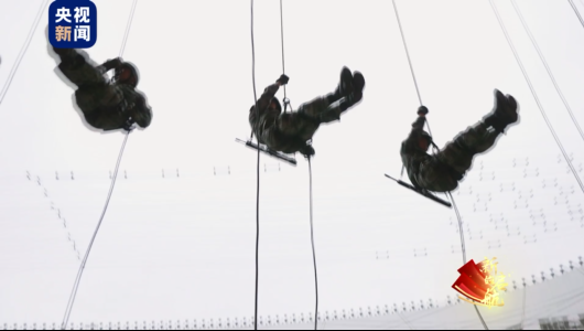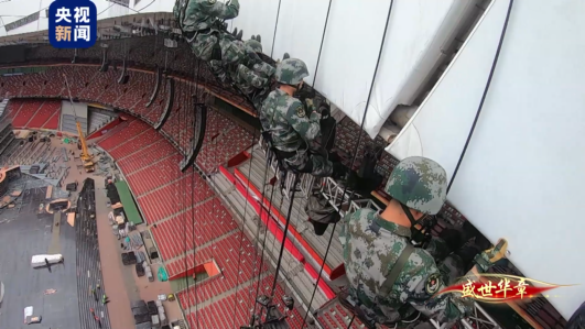 随着一声“将士们”的号令响起,“鸟巢”的顶端犹如神兵天降,突然出现了一群索降战士的身影,夜空中,他们仿佛是从大屏幕中悬停的直升机上滑降着陆。