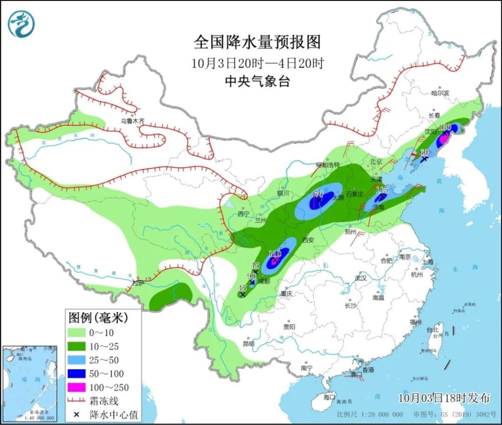 10月3日20时至4日20时,东北地区东南部、西藏东南部、西北地区东部、华北大部、黄淮东部、川西高原北部和四川盆地西部等地部分地区有中到大雨,其中,吉林南部、辽宁东部和南部、甘肃东部、陕西北部和西南部、山西中部、山东北部、四川盆地西北部等地部分地区有暴雨或大暴雨。
