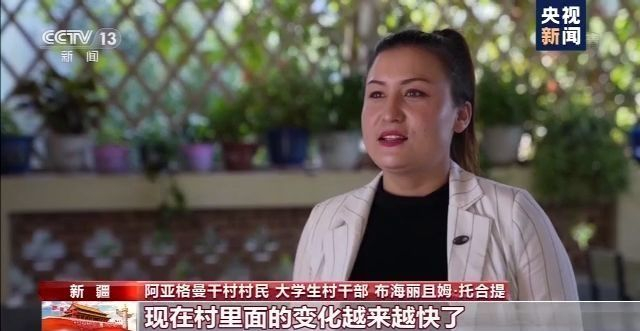 阿亚格曼干村村民 大学生村干部 布海丽且姆·托合提: 现在村里的变化越来越快。我作为村里的年轻人,希望大家我们一起努力,把我们村建成新疆最美丽最漂亮的一个村。