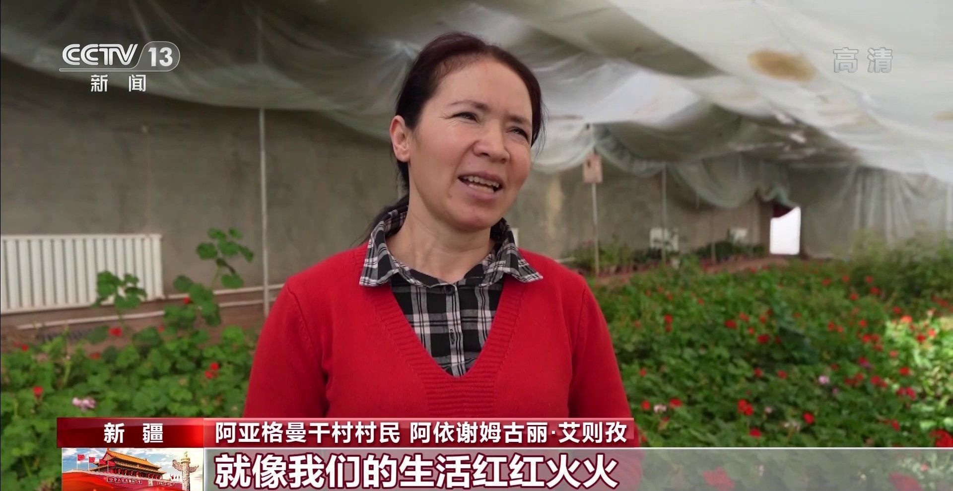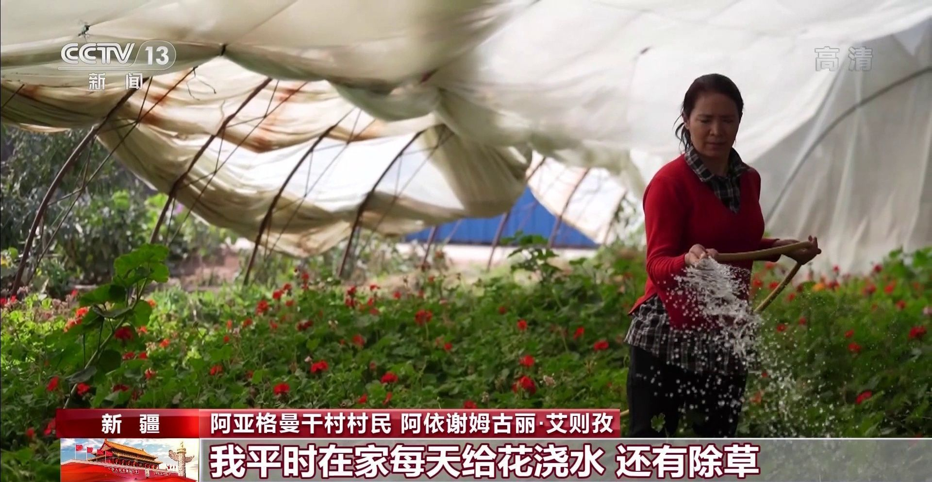 阿亚格曼干村村民 阿依谢姆古丽·艾则孜:我平时在家每天给花浇水、除草,绣球花、牵牛花、三角梅还有芦荟,花太漂亮了,一盆绣球花10~15元。现在生活越来越好了,我也喜欢打扮了,我最喜欢穿红色的衣服,就像我们的日子红红火火。
