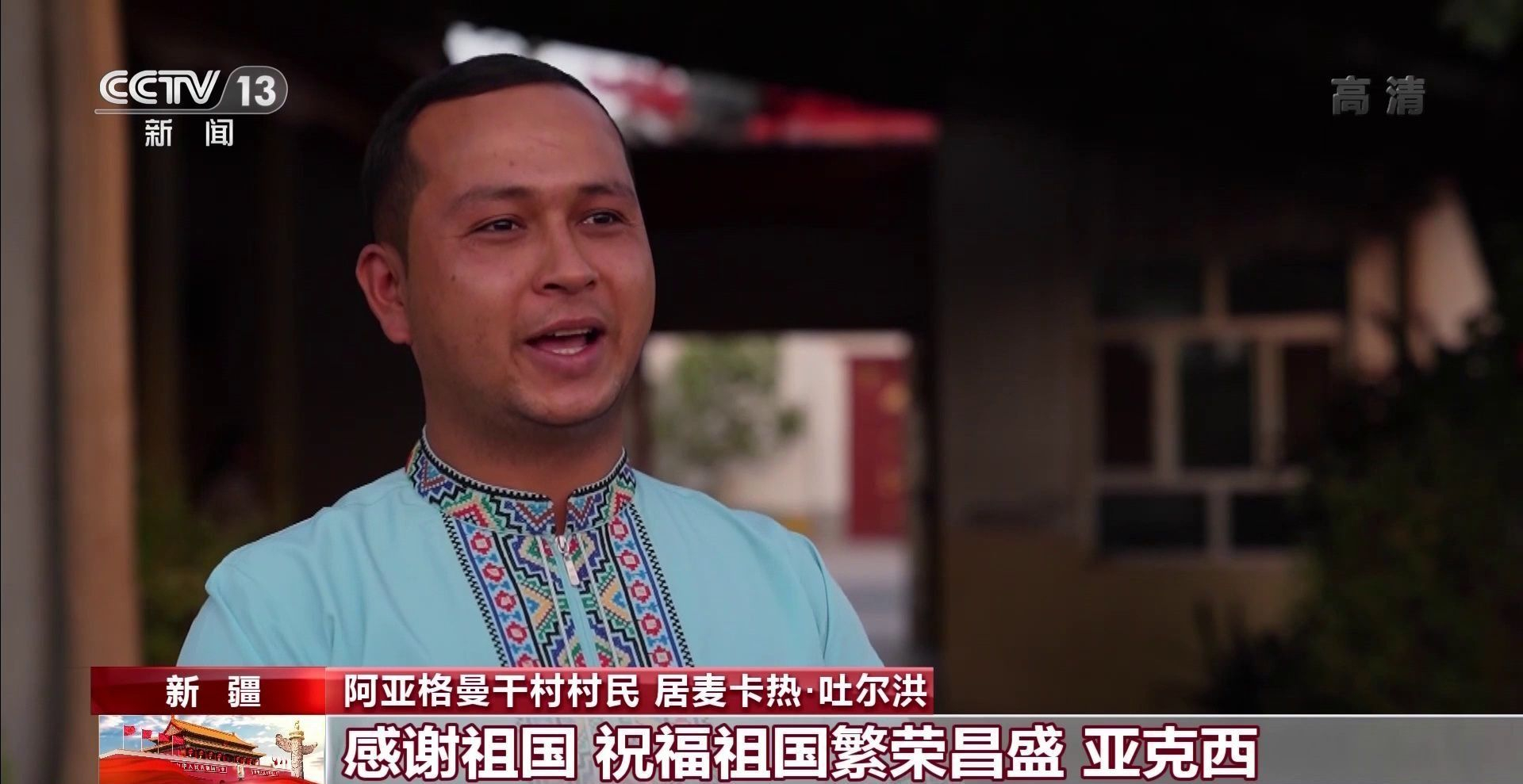 阿亚格曼干村村民 居麦卡热·吐尔洪: 我们农村的生活赶上了城市的生活,这些都是党和国家的好政策给我们带来的。今天我们大家一起唱歌,一起跳舞,感谢祖国,祝福祖国繁荣昌盛,亚克西。