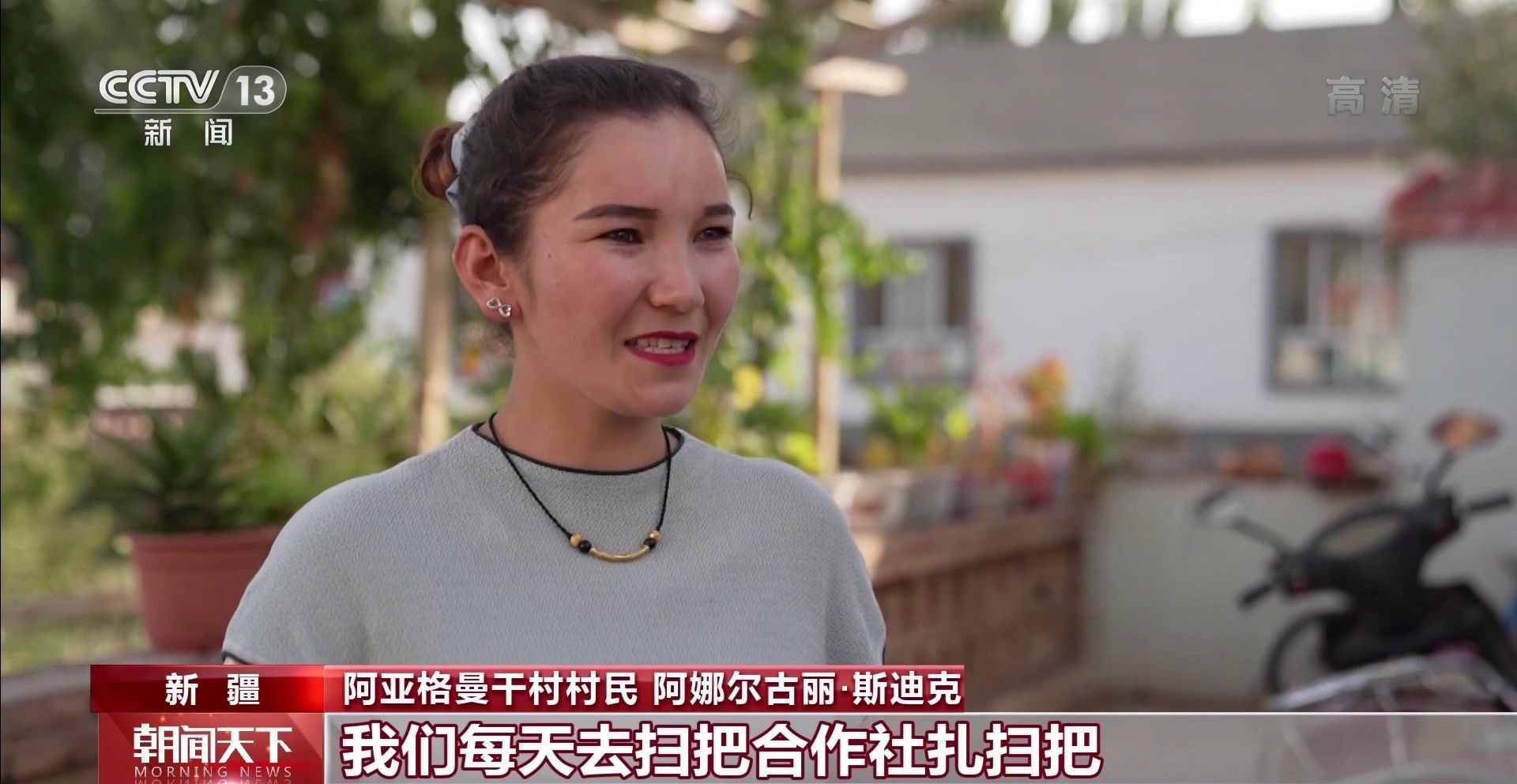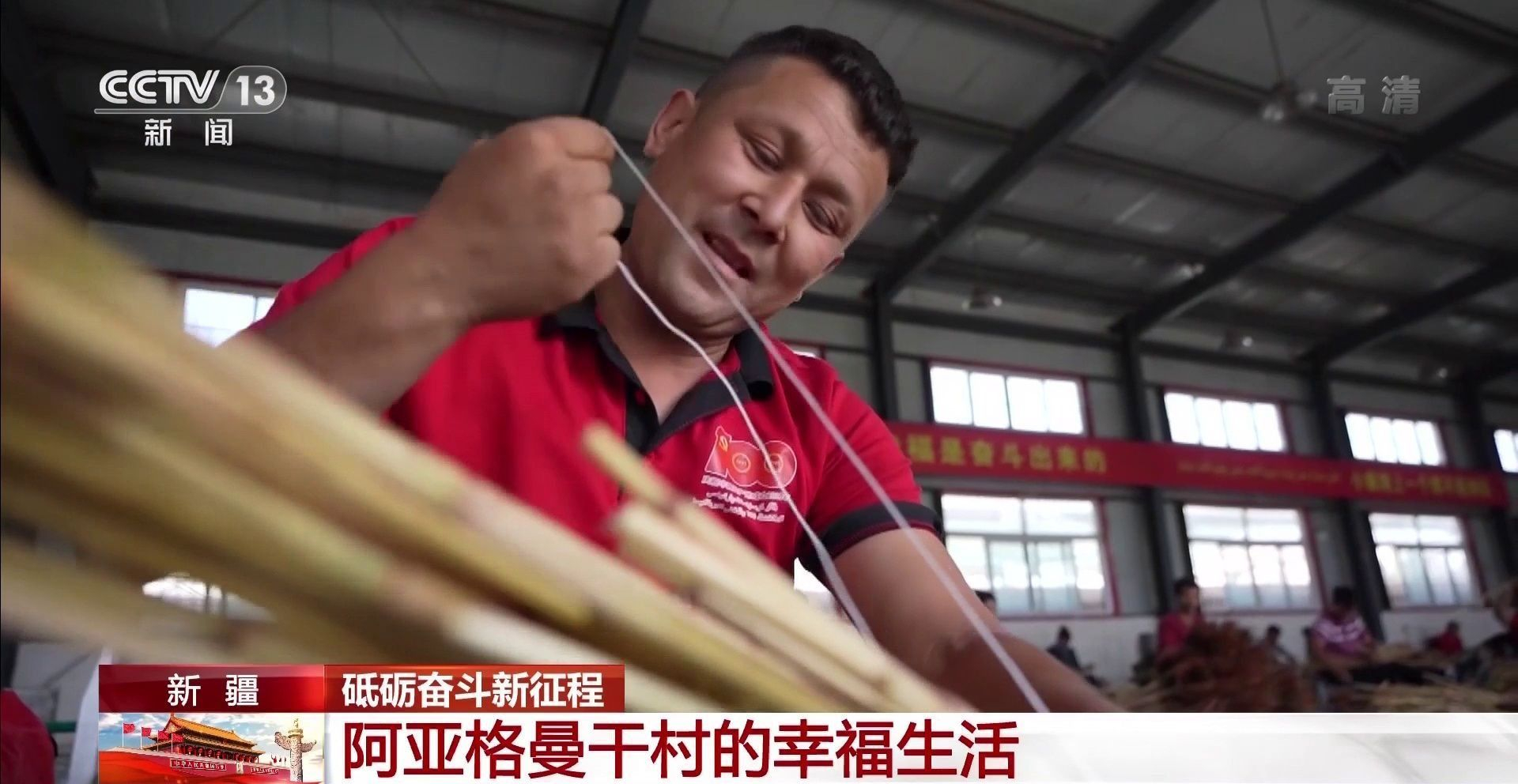 阿亚格曼干村村民 阿娜尔古丽·斯迪克: 我们在合作社做扫把,也可以在家里做扫把,一个扫把赚5块钱,我们家一年光做扫把就能赚7万块钱。现在我们的生活很幸福,我们的心里甜蜜蜜。