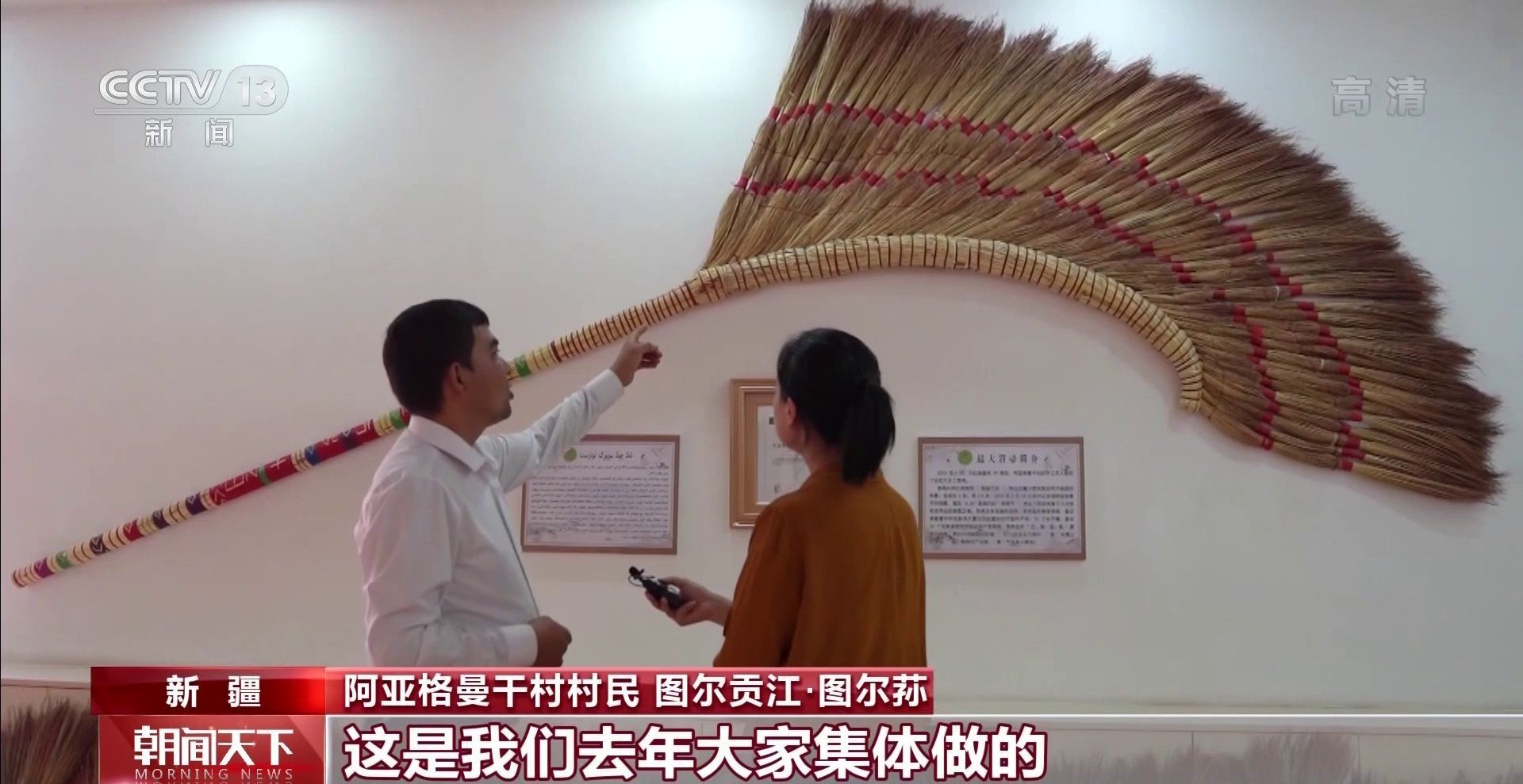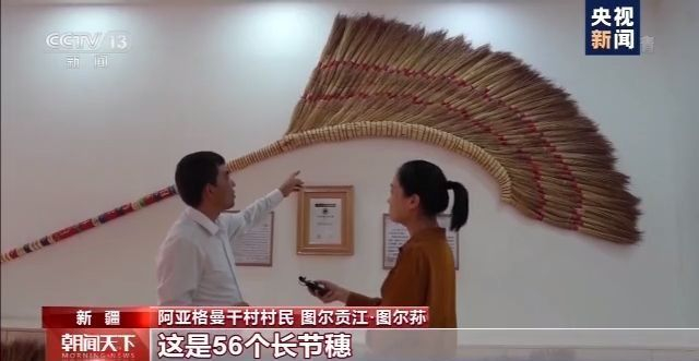 阿亚格曼干村村民 图尔贡江·图尔荪: 这是我们去年大家集体做的,这是56个长节穗,象征着56个民族团结在一起,是我们对祖国的祝福。我现在正在学习设计这种工艺品扫把,希望能有更多的人喜欢,能把我们的特色扫把销售到更远的地方。