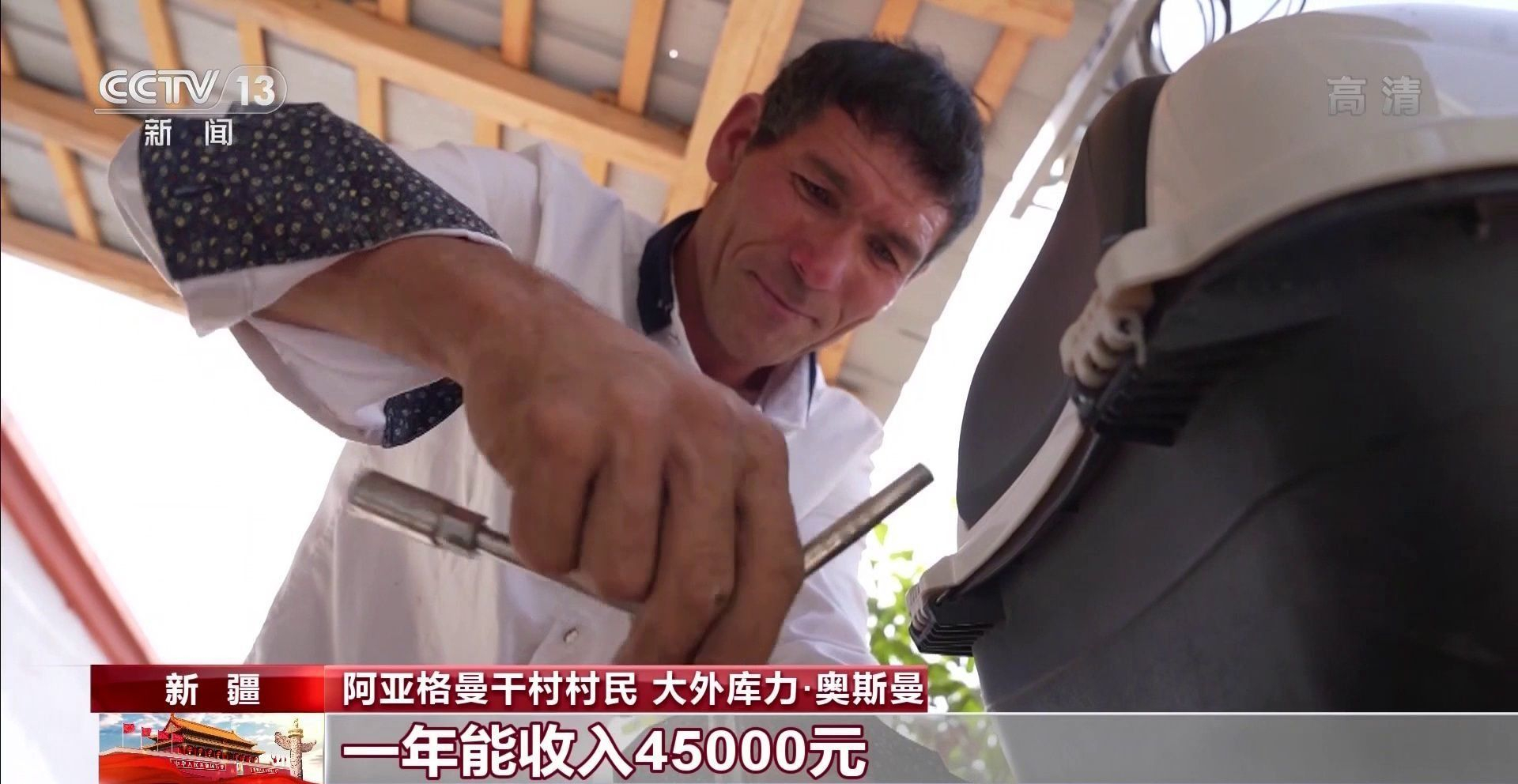 阿亚格曼干村村民 大外库力·奥斯曼:我去年向政府申请了取消低保。党的脱贫攻坚的好政策扶持了我们这么多年,现在我家里养了牛羊,开了修理铺、小卖部,一年能收入45000元。赶上了好时代,现在每天都很有奔头。我今后会更加努力赚钱,靠自己双手来致富、来奋斗、来过上更好的日子。