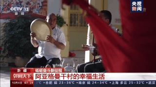 在新疆喀什阿亚格曼干村阿卜杜柯尤木家,这个假期,大家弹起艾捷克,敲起手鼓,载歌载舞欢度国庆佳节。
