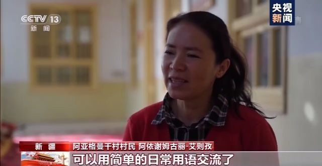 阿亚格曼干村村民 阿依谢姆古丽·艾则孜: 我以前不会说普通话,现在普通话的水平提高了,可以用简单的日常用语交流了,我会继续学习,有机会我想去北京、去全国各地走一走看一看。