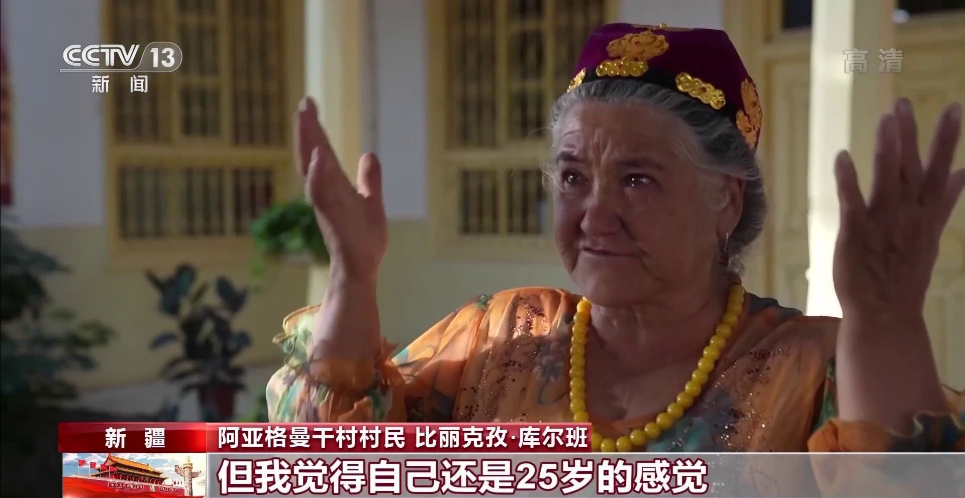 阿亚格曼干村村民 比丽克孜·库尔班:我今年75岁,但我觉得自己还是25岁的感觉。我们赶上了好时代,最幸福的时代。以前我们住的是土坯房,现在是安居房;以前脏乱差的泥土路,现在是宽敞的柏油路。生活上不愁吃、不愁穿、不愁住,口袋里有钱花。我内心非常感激,祝福祖国,祝福全国人民幸福安康。