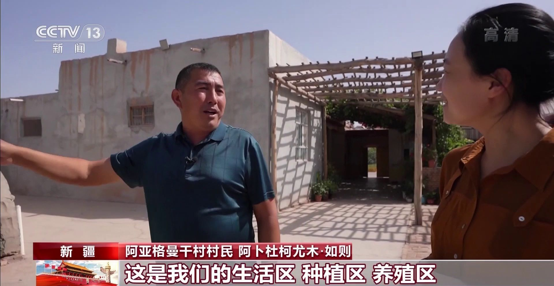 阿亚格曼干村村民 阿卜杜柯尤木·如则: 这是我们的生活区、种植区、养殖区。种植区花房一年的收入3万元,养牛收入6万,现在有8头牛,拖拉机干活收入2万,光这个庭院一年大概收入11万多。