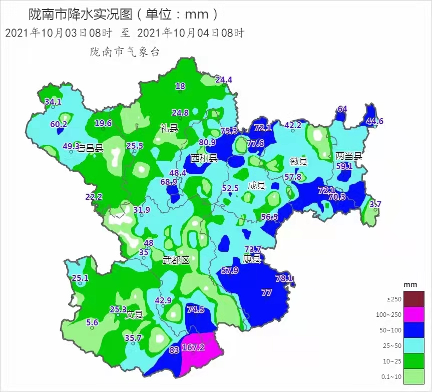 据陇南市气象局数据显示,10月3日8时至10月4日8时,陇南市的雨量观测点中,有56处出现暴雨,2处出现大暴雨。其中,最大的三个雨量点均在文县,其中文县碧口167.2毫米,文县中庙109.6毫米,文县范坝83毫米。