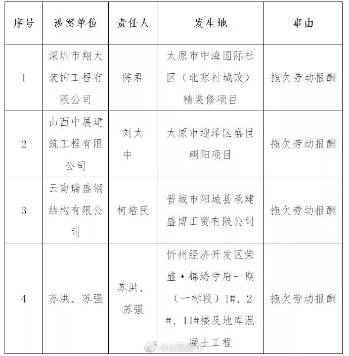 央视网消息:据@山西发布微博消息,为贯彻落实《保障农民工工资支付条例》,规范农民工工资支付行为,维护社会和谐稳定,根据《山西省人民政府办公厅关于全面治理拖欠农民工工资问题的实施意见》和《山西省用人单位重大劳动保障违法行为实施社会公布暂行规定》的要求,山西省人民政府农民工工作暨根治拖欠农民工工资工作领导小组办公室近日向社会公布4起拖欠劳动报酬案件。
