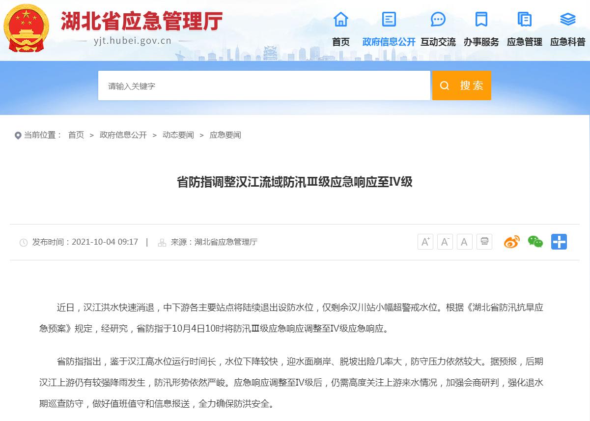 央视网消息:据湖北省应急管理厅网站消息,根据《湖北省防汛抗旱应急预案》规定,湖北省防指于10月4日10时将汉江流域防汛Ⅲ级应急响应调整至Ⅳ级应急响应。