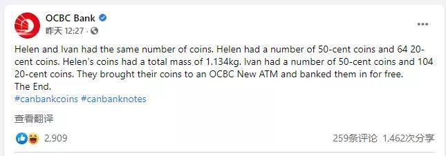 华侨银行(OCBC)就说,海伦和伊万可以将硬币带到华侨银行的现金存款机,免费存入银行。