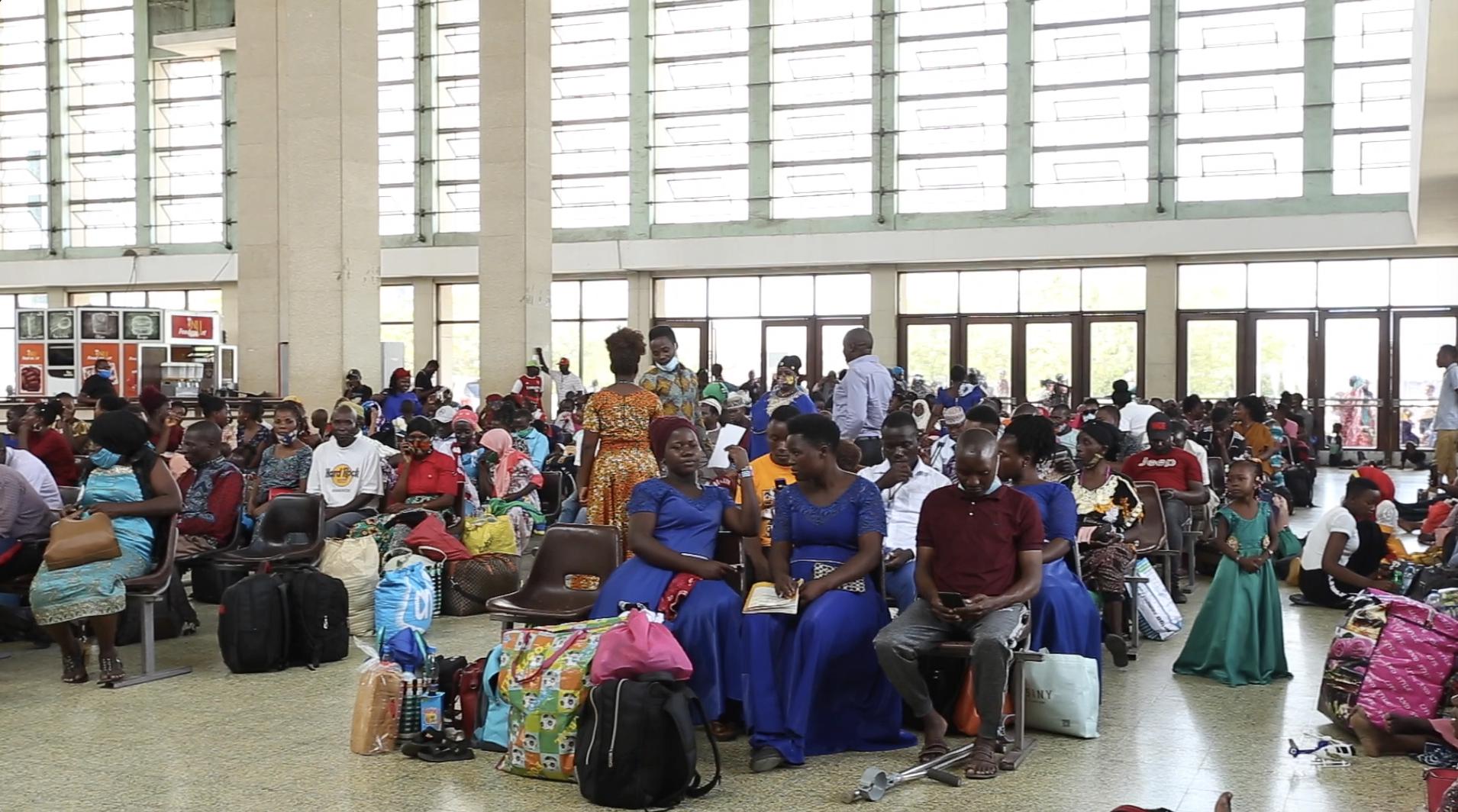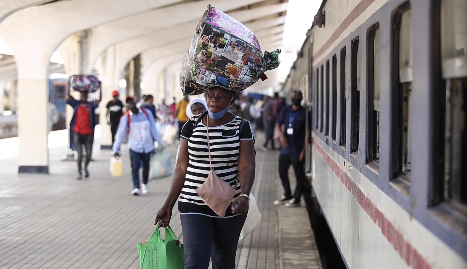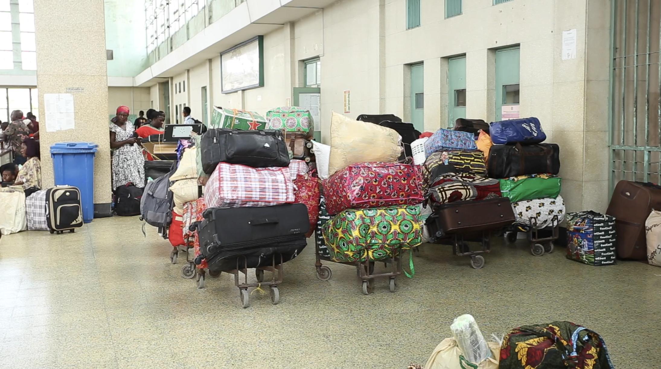 火车站的候车大厅里都是候车的人和行李。带货能力哪家强?非洲人民头顶肩扛。