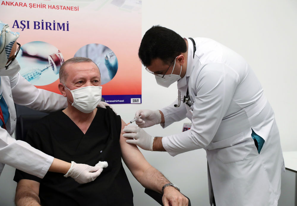 1月14日,土耳其总统埃尔多安(中)在安卡拉一家医院接种中国新冠疫苗。(新华社发)