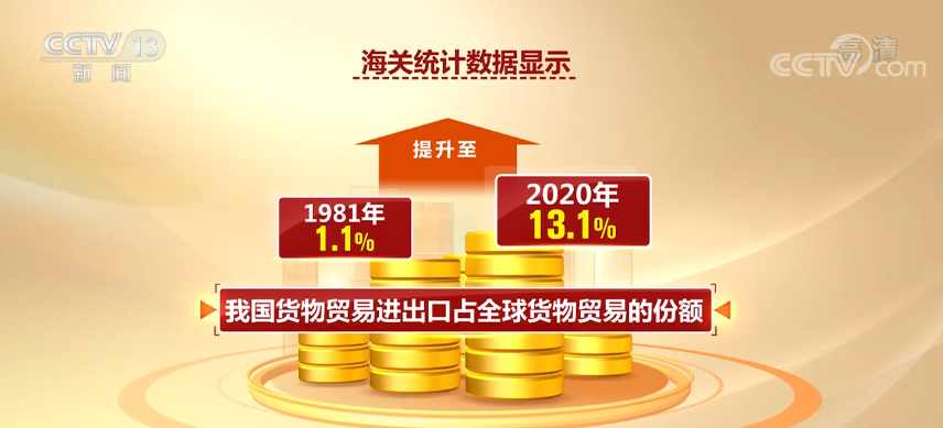 货物流转越来越快,也匹配着中国外贸的发展速度。海关统计数据显示,我国外贸规模从1981年的735亿元人民币增长到2020年的32.16万亿元人民币,扩大了436.5倍。我国货物贸易进出口占全球货物贸易的份额从1981年的1.1%提升至2020年的13.1%。