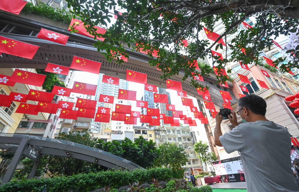 今年是新中国成立72周年。国庆节前后,香港多区挂满国旗和区旗,在蓝天白云的映衬下,“中国红”格外鲜艳。各界亦举办了不同的庆祝活动,有香港市民高兴地表示:“今年的国庆节比以往任何一年都开心,大街小巷到处都是中国红,特别祥和,我们作为中国人,感到特别幸福和自豪。”