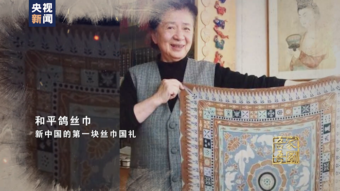 1952年,21岁的常沙娜以敦煌图案为基本形式,为第一届亚洲及太平洋区域和平会议设计了一款《和平鸽》丝巾,在国际上获得了高度赞赏。这也是新中国的第一块丝巾国礼。