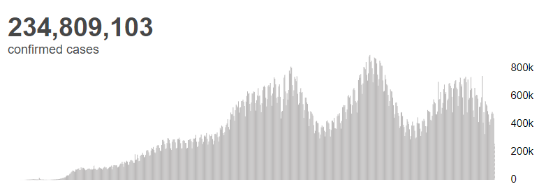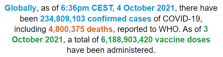 据世界卫生组织最新实时统计数据,截至欧洲中部夏令时间10月4日18时36分(北京时间10月5日0时36分),全球累计新冠肺炎确诊病例234809103例,累计死亡病例4800375例。