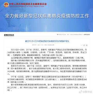 截至10月4日24时,据31个省(自治区、直辖市)和新疆生产建设兵团报告,现有确诊病例856例(其中重症病例3例),累计治愈出院病例90792例,累计死亡病例4636例,累计报告确诊病例96284例,现有疑似病例1例。累计追踪到密切接触者1202843人,尚在医学观察的密切接触者27526人。