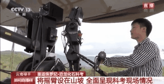 恐龙化石有大有小,科考现场也是繁重复杂。为了更加准确、全面地呈现出科考作业的全貌,在直播过程中设置了一个比较特殊的机位——虚拟摇臂,拍到了很多地面机位无法完成的视角画面,让观众能很宏观地看清楚科考全貌。