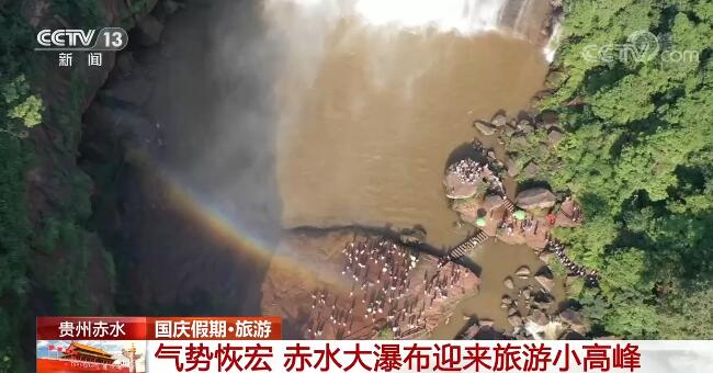 在贵州赤水丹霞旅游区大瀑布景区,壮美的大瀑布气势恢宏、彩虹飞挂,难得一见的“巅峰颜值”吸引了众多游客,大家纷纷拍照留念。