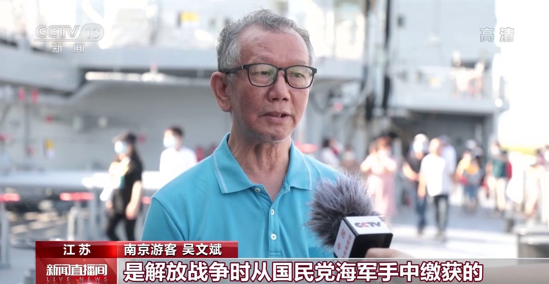 南京游客 吴文斌:我是一名退伍老兵,1968年入伍后,服役于海军东海舰队舰艇部队洪泽湖号上。当时的洪泽湖号,是解放战争时从国民党海军手中缴获的,是美国制造的,它服务于海军很多年,被我们现在参观的这艘大型综合补给舰所取代。看到一艘艘先进的、高科技的、大吨位的海军舰艇入列,我感到非常高兴,非常振奋。