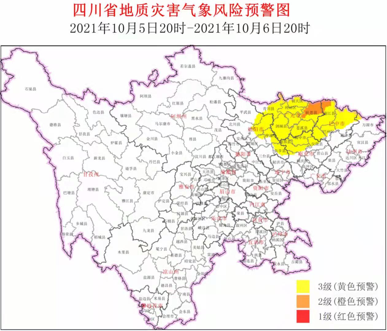 四川省地质灾害指挥部办公室发布消息称,今天(10月5日)20时至明天20时,四川省地质灾害气象风险2级橙色预警区域共有2个县,3级黄色预警区域共有20个县(市、区)。