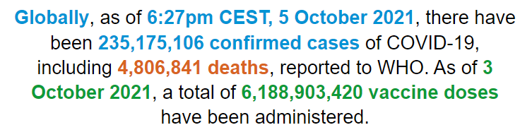 根据世卫组织最新实时统计数据,截至欧洲中部夏令时间10月5日18时27分(北京时间10月6日0时27分),全球累计新冠肺炎确诊病例235175106例,累计死亡病例4806841例。5日全球新冠肺炎确诊病例新增355049例,死亡病例新增6303例。(总台记者 朱赫)