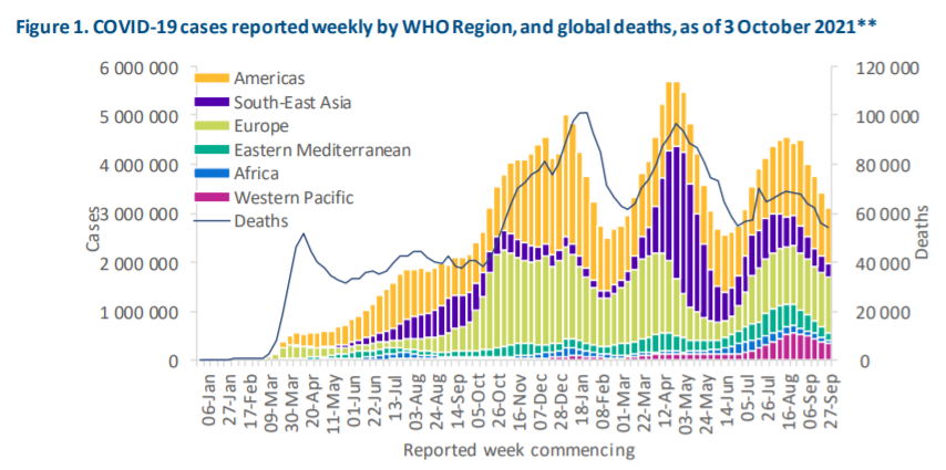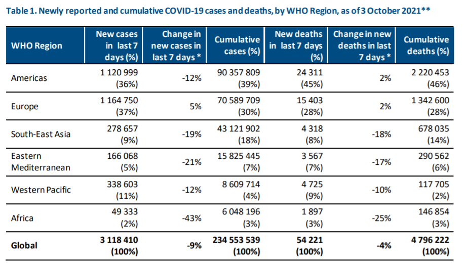当地时间10月5日,世卫组织发布的新冠肺炎每周流行病学报告显示,上周全球新冠肺炎新增确诊病例和新增死亡病例均继续下降。