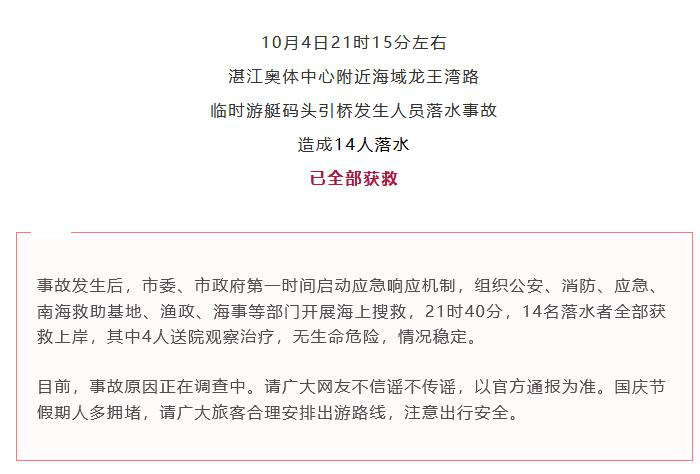 ·广东湛江一游艇码头14人落水:全部获救上岸,事故原因待查。