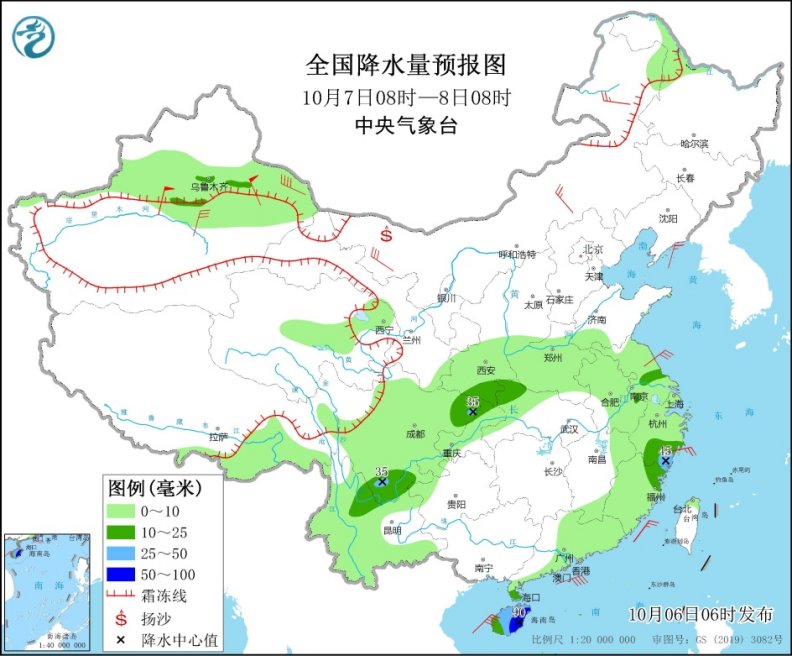 10月6日08时至7日08时,新疆西北部高海拔地区有小到中雪或雨夹雪,局地大雪;东北地区南部、西北地区东南部、华北中南部、黄淮西部、江汉西部、西南地区东部、云南东北部、海南岛等地的部分地区有中到大雨,其中,陕西南部、四川盆地东北部等地局地有暴雨(50~90毫米)。新疆北部、内蒙古东南部、华北南部、黄淮西部、江汉等地的部分地区有4~5级风(见图1)。