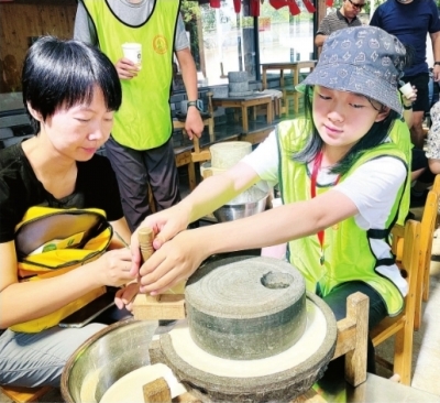 楚才小记者们学习磨豆腐。 见习记者刘昊洁 摄