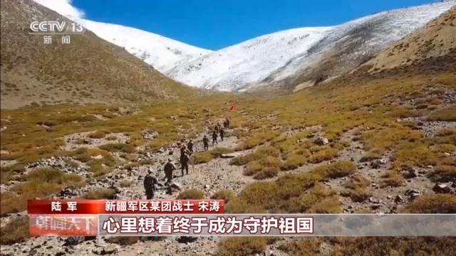新疆军区某团战士 宋涛:这里的山和家里的不一样,这里能看得很远、很远,天也很蓝。能穿上军装巡逻在祖国的边防线上,心里想着自己终于成为守护祖国、守护身后万家灯火的军人,心里就很激动、骄傲。