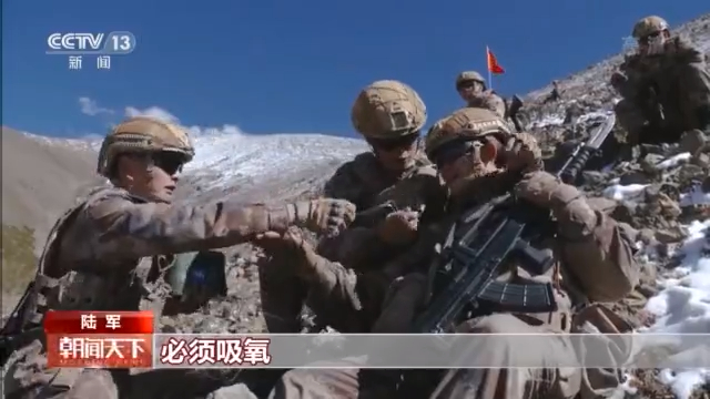 从海拔4500米的营区到5200米的巡逻点位,气温骤降,雨变成了雪,巡逻道路越发陡峭难行,官兵们借助攀登绳攀爬,相互搀扶,艰难前行。随着氧气含量逐渐下降,第一次巡逻的何龙龙出现了缺氧症状,排长庞智杰拿出随身携带的制氧机,让新战友吸氧。