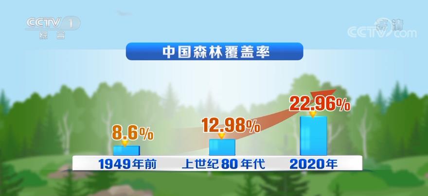 1949年以前,中国的森林覆盖率只有8.6%,新中国成立后的30年时间保持在12%左右,而从上世纪80年代开始,森林覆盖率从12.98%上升到了2020年的22.96%,相当于40年间多了10%的国土面积被绿化,我国也成为世界上森林增长最快的地区。