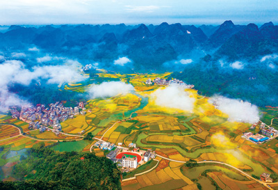 金秋时节,广西壮族自治区靖西市禄峒镇平江村金黄的稻田与民居、云朵、喀斯特地貌相映成景。何华文摄(影像中国)