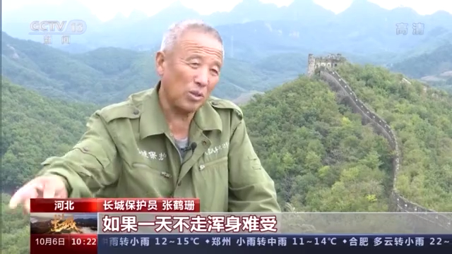 长城保护员 张鹤珊:走长城也有瘾,走了40多年,如果一天不走浑身难受。不带夸张地说,就说外面这层,只要有一块砖石动了,我都能看出来。